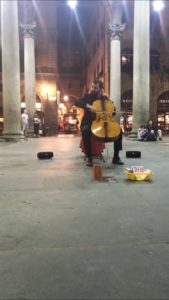 After we were granted our free time for the rest of our first night in Florence a small group that consisted of Carly, Nicole and I walked down, what I assume was the Main Street with most shops and even a Carousel. A little more walking and we came to one of the many places where there was previously a leather market set up. Although at the time of night we came across this place it was empty. Except for a single cello player who was arched by a few people in attendance. The atmosphere was indescribable. He played a song which I cannot remember the name of but, as a former strings musician, I really stood there and took notice of how his fingers moved, how his bow moved, how his facial expressions really touched me in some way.