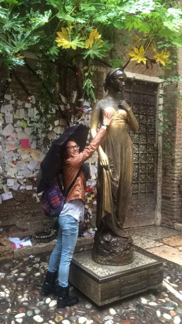 Out of all of the tourist places I’ve seen, I don’t think I have seen one quite as majestic as Juliet’s balcony. First, you walk into this short tunnel completely graffitied with hearts, names, and years –its so overwhelmingly beautiful. Then, you walk into this beautiful green courtyard –directly ahead there is gold statue of Giulietta and above her to the right is her balcony. The rain was cold and pelting the ground, but even so, my heart flutter, and like Michelangelo’s David, I saw Giulietta’s statue as a human being.